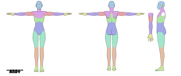 This is Andy, one of the templates our 2D team uses to draw different costumes. As you can see, the drawing is of a front, back, side, and top view of the character. What I do is cut the image down into smaller pieces and set them up as reference images in the software. I then use a technique known as box modeling to fit 3D geometry into the shape of the reference image, and poof, we have a 3D model:
